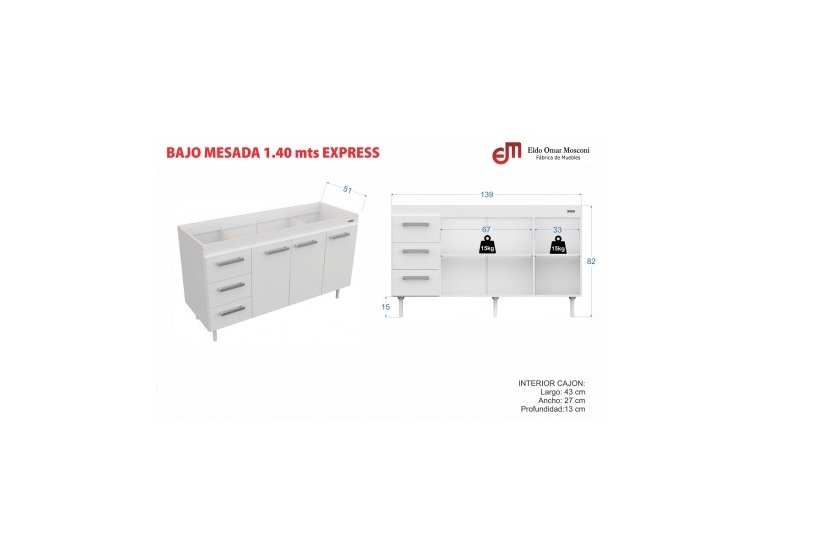 - Medidas: Bajo: Ancho 140 cm – Prof. 51 cm – Alto 82 cm